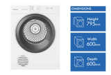 At just 600mm wide, it fits into compact laundry areas. The white finish blends seamlessly into your existing decor. Set the buzzer to alert you when loads are done. With extra, cupboard and iron dry settings, remove clothes at your preferred dryness level.