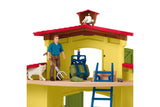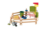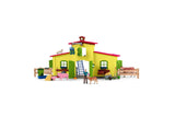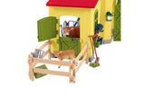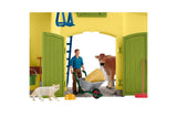 Farmer Paul always has his hands full. The pigs are grunting loudly and want to be fed, and the cow in the barn is already looking pretty hungry. But before Farmer Paul feeds her some hay, the little calf gets its milk from the bottle. All the animals come into the barn to eat. Especially the pigs, hoping for a juicy apple or a crunchy carrot. Once they have eaten their fill, they go back outside. Farmer Paul has put up fences around the farm so that everyone can get some fresh air. But the fences don’t stop the cat from climbing onto the roof or the doves from flying all over the place. They always come back, though, because Farmer Paul takes such great care of them, too. He has even built the doves their own house, called a dovecote, where they like to hide from the cat when it comes slinking around. Pretty nifty! There’s room for even more animals in the matching pony box, which is available separately. Fun Fact: The cat prefers to walk on the roof. The mouse likes to hide in the hayloft. Content: 1x stable building, 1x Farmer Paul, 1x cow, 1x calf, 1x pig, 1x piglet, 1x cat, 1x dove, 1x mouse, 1x dovecote, 2x flower box, 2x straw feeder, 4x fence long, 2x fence short, 1x crane with winch, 1x fodder carousel, 1x hay hollow, 1x water hose, 1x ladder, 1x feed box, 1x rack, 1x bowl, 1x feeding bottle, 1x cow brush, 1x feeding trough, 1x pitchfork, 1x spikeable hay, 1x broom, 1x wheelbarrow, 1x bucket, 1x straw bale, 1x hay bale, 8x carrots, 6x apples, 1x eggs, 1x sticker sheetIncludes: