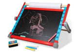 - Tabletop easel with storage tray features magnetic dry-erase board on one side, chalkboard on the other
