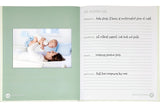 Fill on pages of this baby album with prompts like about mommy, about daddy, family tree, mommy’s pregnancy, baby shower, delivery, arrival, coming home, visitors log, hands and feet, current events, pop culture, first day’s home, twelve months, first milestones, favorite things, first holidays, first birthday, second birthday, third birthday, first day of preschool, first day of kindergarten, growth chart.