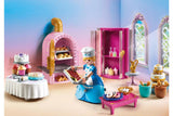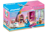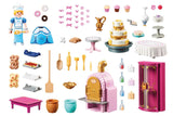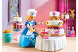 In the royal bakery the chef conjures up delicious cakes and tarts. She is currently working on the decoration of a three-tiered cake, a true masterpiece of the art of baking. She carefully presses small floral patterns onto the cake with the piping bag, then bows and crowns are placed – finished. The baker is already looking forward to presenting her dream cake on the big market of wishes. The room is filled with the delicious smell of bread rolls. The cook quickly takes the fresh rolls out of the oven. Delicious! The playset includes a PLAYMOBIL figure, an oven with trays and rolls, a three-tiered cake, a piping bag, bows, crowns, cupcakes, a table, a side table, a cupboard and many other extras.