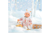 With its sleeping eyes, it falls asleep when put down on its back. It is dressed in a long sleeved dress, a pair of gold tights with ballet flats all in one along with a sleeveless vest. She is also wearing a matching beanie with fawn ears.