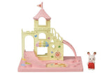 Baby Castle Playground is a castle-themed playground for babies, and includes one baby figure. Baby Castle Playground comes as a set with one Chocolate Rabbit Baby figure. This playset is immediately ready for play as a stand-alone product. It includes a slide, ladder, sandbox, and other fun baby playthings. The castle parts can also be placed on top of Baby Castle Nursery for an even more elaborate school setup (sold separately).