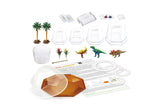 Contents: White crystal compound, 3 small bags containing colourant, 1 small bag containing white seed compound, 1 stirring bowl, 2 white gravel, 1 stirring spoon, transparent cups (1 large, 1 medium, 2 small) , 1 transparent cover tray, 3 dinosaur figures, 2 trees, 2 plants, and detailed instructions.