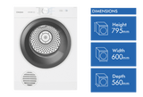 The simple timer and electronic controls with a LED display let you easily select options and monitor cycle progress. At 600mm W x 795mm H x 560mm D, this dryer is compact enough for apartments and small laundry rooms.
