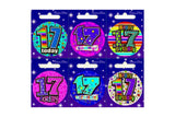 - This pack of 6 badges each with a different terrific design supplied on a backing board are sure to stand out and are an essential addition to birthday celebrations! Each badge diameter measures approx.