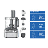 | What's In The Box: | Food Processor, 3.0 Litre Bowl, 1.5 Litre Thermo resist Glass Blender, Citrus Juicer, Micro- Serrated Knife Blade, 2mm + 4mm Reversible Slicing/Grating Disc, Extra Fine Grating Disc, Dual Metal Whisk, Dough Tool, Smart Store Bag, Spatula, Weighing Tray, Express Serve and Express Dice |