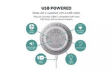USB powered: Mains powered by a USB Type C cable (1.2 m length) and adaptor plug*. The device must be connected to the mains to function. *Plug not included but the cable is compatible with most USB plugs used as phone chargers.