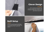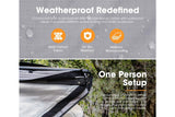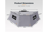 Discover utmost convenience with our 180° awning, featuring Incorporated Support System for quick one person setup. Whether you are resting or cooking under the spacious 7.8 m2 shelter, it will stay firmly in place, offering a panoramic view with reliable protection from UV radiation and unexpected downpours.With the vertical legs hinged to the horizontal arms, each piece effortlessly falls into place, sparing you from the search or management of multiple loose components while setting up your shelter. Crafted from mold-resistant 600D double-ripstop Oxford, our free-standing awning delivers 3000mm waterproofing and UV50+ protection,ensuring your camping experiences won’t be interrupted by sudden storms or scorching heat. The unyielding aluminum framework, fortified by stainless steel knuckles,stands steady even in adverse wind conditions of 48 knots.The fire-retardant storage bag is crafted from 580gsm PVC,keeping San Hima 4×4 awning safe from damage and the elements during transport.