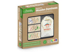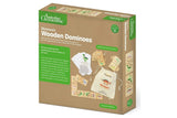 - Contains: 32 wooden domino pieces, a convenient drawstring bag for storage, plus 4 double-sided information cards on different dinosaurs.