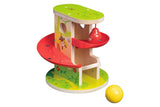 Sliding is fun! Make the wooden ball race around the tree to the jungle floor. Then press the lever to start all over again! Press the lever to launch the ball onto the slide so it rings the bell. Then press to go again and again!