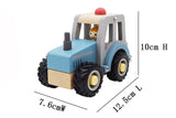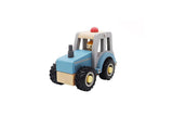 Sturdy blue wooden tractor with rubber wheels to protect surfaces. Featuring natural beech wood and non-toxic paint. Cute little farmer behind the wheel.