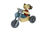 Medium sized, retro styled, open-wheeler, wooden motorcycle with cute dog rider. Beautifully made with beech wood and water base paint. Adorable and sturdy enough to play with. Available in red or blue.