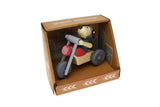 Medium sized, retro styled, open-wheeler, wooden motorcycle with cute dog rider. Beautifully made with beech wood and water base paint. Adorable and sturdy enough to play with. Available in red or blue.