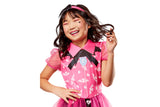 - Dress features a pink collar and attached bat-like satin bow detail and emblem