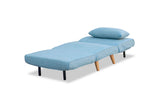 It's upholstered in soft aqua blue fabric and is crafted with a solid wooden frame and legs.
