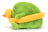 Ricky Rain Frog is ready to relax. Our favourite grumpy frog has found a duck rubber ring in bright yellow cotton to compliment his soft, pea-green fur. Ricky may be sporting a big, stitched frown, but this frog’s got summer vibes for everyone!