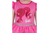 - Pink dress with iconic Barbie logo in gold sequin design on the bodice