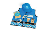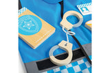 The Bigjigs Toys police officer dress up set comes with a blue police officer vest, baseball cap, wooden walkie talkie, ID badge, ID wallet, a torch and hand cuffs.