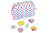The bag has a lovely pink, purple, and blue checkered pattern and heart charm on the zipper. Fully lined and patterned. So chic, practical, and fun to decorate! This makes the perfect gift for stylish tweens, no matter the occasion. A colorful addition to any outfit to complete the look. Perfect for storing cosmetic products, accessories, pencils and pens, and anything else to be taken on the go!