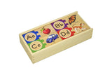 The alphabet has met its match! This alphabet box is filled with 26 two-piece puzzles, pairing upper and lowercase letters with illustrations to match. Each wooden puzzle piece fits only with its correct match, so children can work by themselves to learn letters in a way that’s frustration-free.