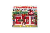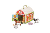 Unhook the latches to open the barn doors and see who is inside, then close the doors and buckle up the barn again! This beautifully crafted sturdy wooden barn is brightly painted both inside and out. It features six brass-hinged doors with working latches and locks, and pictures of farm animals on the inside of each door. There’s even a brass handle on top to take the fun wherever kids go! The set comes with four approximately three-inch-tall flocked play figures – a cow, a pig, a goat, and a horse – that fit in the barn. Great for fine motor development, as well as color and animal recognition; encourages creative play.