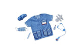 - Includes jacket, mask, cap, thermometer, stethoscope with sound effects, bandage, syringe, plush dog and reusable name tag.