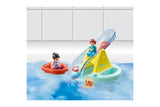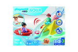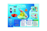 The set contains two PLAYMOBIL 1.2.3 figures, an octopus, a bathing island with water slide and a boat. PLAYMOBIL 1.2.3 AQUA playsets playfully promote fine motor skills and an understanding of relationships. Using the red marked elements, water fans immediately discover the various play functions. The swimming island, the boat and the octopus are buoyant. The Water Seesaw can be ideally combined with set 70636 Water Wheel with Baby Shark.