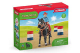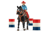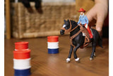 Barrel racing is the exhilarating rodeo sport that puts the wind in your hair…let’s ride! The Cowgirl Barrel Racing Fun playset puts you in the saddle with a toy Appaloosa Stallion, a cowgirl figurine, 3 barrels, plus a Western saddle, bridle, and harness. Grip those reins, tight and keep your feet in the stirrups…this playset is recommended for lil’ hosses ages 3 and up.