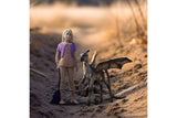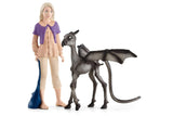 Luna Lovegood, is seen here barefoot with her long blonde hair, her purple vest, and her blue bag. The little Thestral stands next to her with its wings spread out.