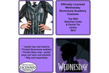 - Jacket in pin-striped black and grey tones with Nevermore Academy crest printed on left chest and three buttons, plus attached white cuffs