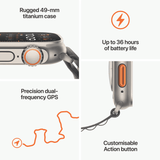 The 49mm corrosion resistant titanium case has a large Digital Crown and customisable Action Button for instant control over a variety of functions.