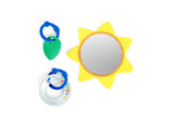 Interactive features such as steering wheel, shifter, and 2 toy mirrors for play