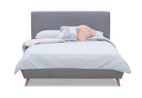 It is upholstered in a light grey, soft polyester linen weave fabric and is a classic design that will suit any bedroom decor.