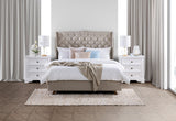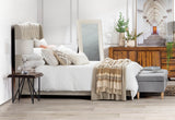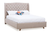 The Aragon Fabric King Bed is upholstered in a lovely light pebble coloured fabric and features a large statement headboard. The fabric headboard is well padded for maximum comfort. The bed has a weight limit of 350kg. It comes ready to assemble and includes a 5 year guarantee.