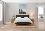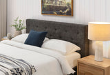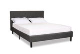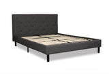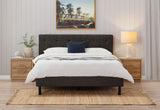 The headboard is plush and both the headboard and frame are fully upholstered in grey fabric.