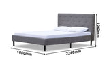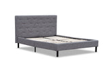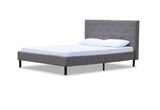 The headboard is plush and both the headboard and frame are fully upholstered in dark grey fabric.