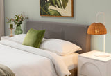 The headboard is upholstered in a lovely grey fabric that is complemented by the beech coloured frame.