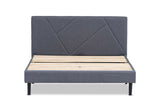 The dark grey upholstered bed frame with a geometric design headboard captures the eye, and the durable and sturdy metal frame has a reinforced centre bar for extra support.