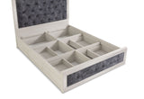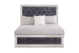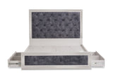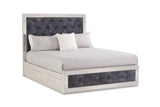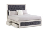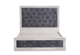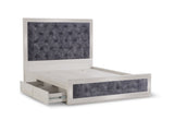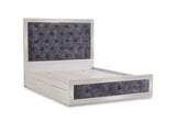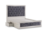 * White Timber Grain Finish with Mirrored Details * 4 Drawers in Bed Base for Additional Storage * High Headboard Frame with Upholstered Insert Featuring Button Detailing *1410H x 2250W x 1610D * Ready to Assemble