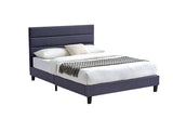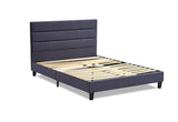 * Upholstered in a versatile dark grey fabric, it features clean horizontal panelling on the headboard that adds subtle texture and style.
