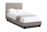 This bed has a fabric upholstered headboard and frame for a sleek, modern design and maximum comfort. It features a sturdy framework and slatted base for durability and support.