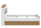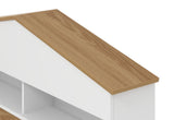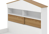 The standout house-frame headboard adds a playful, yet contemporary touch, while including open shelving for books or decorative items. For added convenience, the headboard also features two sliding doors that reveal hidden storage space, ideal for keeping items out of sight.