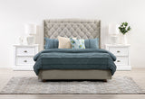 The bed is upholstered in a lovely light pebble coloured fabric and features a large statement headboard.