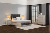 *Queen Bed Features Luxurious High Upholstered headboard with Button *Detialing Bed Features 4 Drawers for Extra Storage Options
