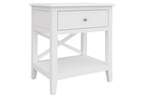In white, this versatile side table is a lovely piece of furniture. You can place a flower vase on it to spread positive vibes in your room. It is a unique side table having a drawer and an open shelf on the lower part. Cross design on the back side enhances its beauty. Its drawer has full extension metal runners and is lined with black felt for better performance. A round silver metal handle makes the drawer look beautiful. The side table is designed in the Hampton style. It has tapered legs and it is made of high-quality Solid Acacia Wood and MDF, obtained in a sustainable manner. The wood makes the table surface silky smooth, super strong, and also resistant to moisture and extreme temperatures. A one-year warranty is included with the fully assembled side table.