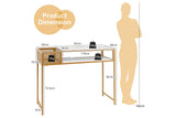 Color: White, GoldMaterial: MDF, SteelOverall Dimension: 110cm x 40cm x 90.5cm(L x W x H)Dimension of Open Shelf: 82cm x 40cm x 16.5cm(L x W x H)Dimension of Mesh Basket: 26cm x 36cm x 18.5cm(L x W x H)Net Weight: 12.5kgWeight Capacity of Tabletop: 20kgWeight Capacity of Open Shelf: 20kgWeight Capacity of Mesh Basket: 10kg