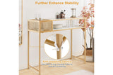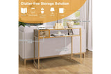 Have you found a practical yet stylish console table? This chic entryway table would be one of your ideal choices. The sleek lines, faux marble tabletop as well as gold steel frame add a sense of charm to your home and show your great taste, making this sofa table a stunning addition for various places. In addition, wide tabletop, open shelf and storage basket can well suit your different needs, which is a great storage solution for optimizing space and also makes your room tidier and cleaner. The combination of MDF tabletop and heavy-duty steel frame brings long-lasting reliable service to you. Meanwhile, the hallway table is equipped with anti-toppling device for higher stability. All in all, the console table is a charming complement for any place, such as living room, bedroom, entryway, etc.
