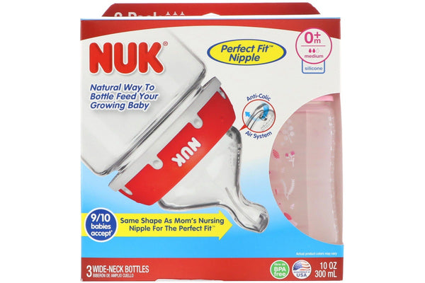 NUK Bottle with Perfect Fit Nipple 0+ Months Medium Feed Pink - 3 Wide Neck BPA Free Bottles (300ml each)