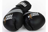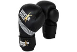 High-quality synthetic leather boxing gloves with double stitching to enhance durability. Black finish with black gloss and metallic gold detail.